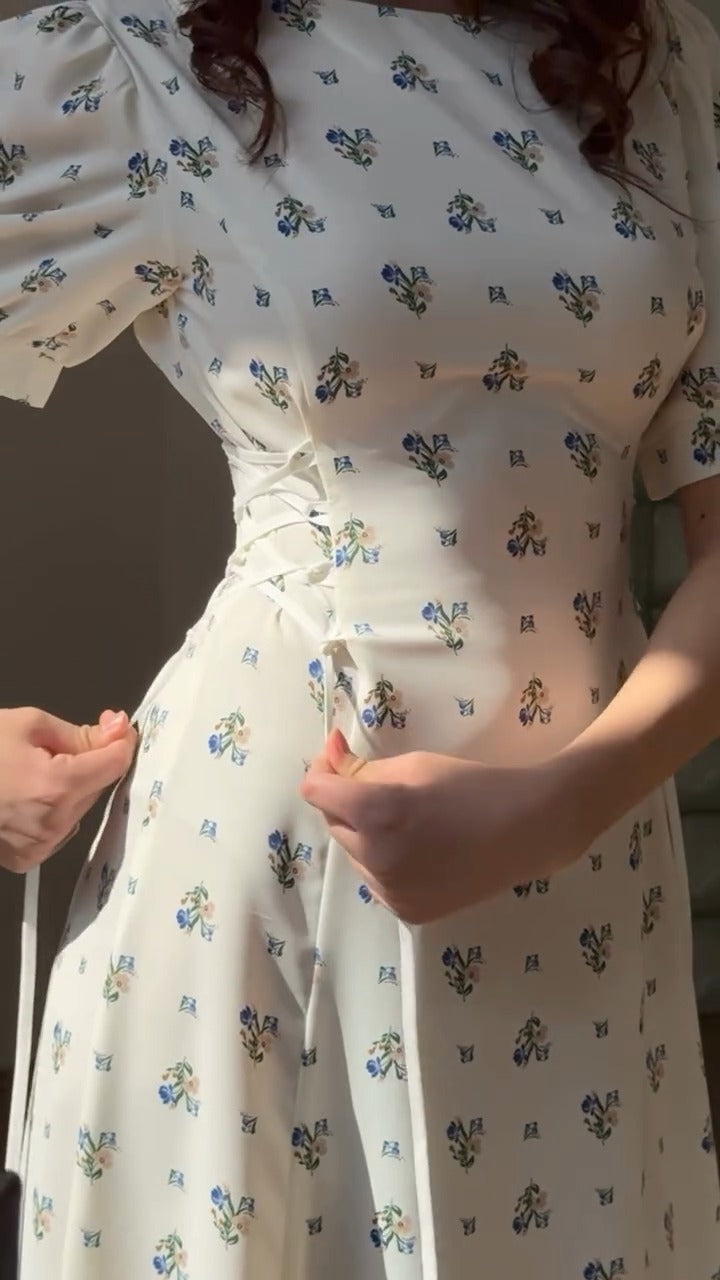 Designed for maximum comfort and elegance, this white floral midi dress exudes effortless style.With its delicate floral designs in shades of blue and green, puff sleeves, and a figure-flattering shape and flare, this dress is ideal for daytime gatherings, casual breakfasts, and summertime excursions.For a stylish and feminine style in 2025, it's the fabric of choice because it's breathable and lightweight.